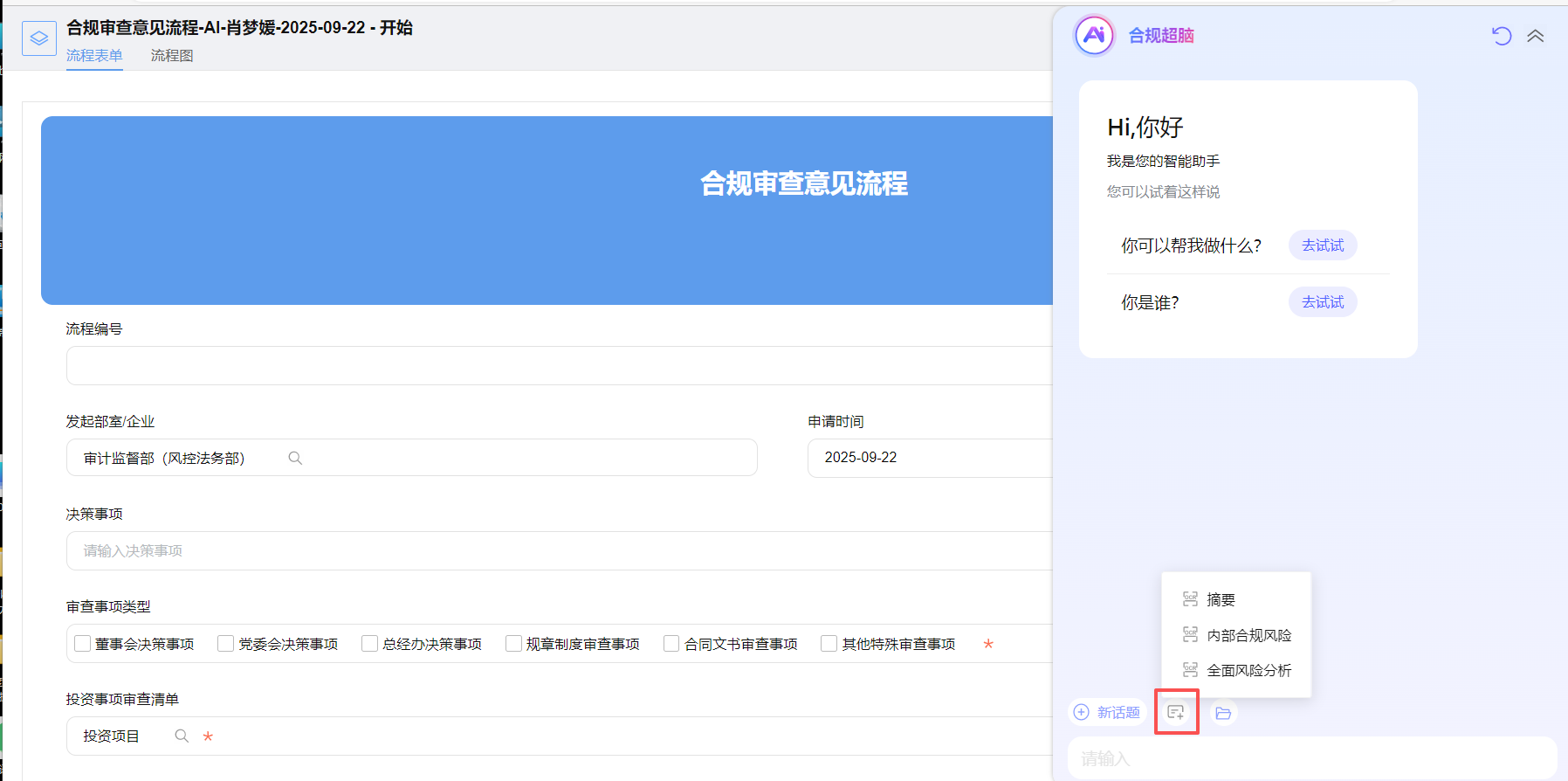 近日,杭实集团审计监督部(风控法务部)倾力打造的“合规超脑”成功接入集团OA。该项目是杭实集团今年“拥抱AI”创新大赛的首个落地成果,项目落地标志着集团的智慧风控迈入新阶段! 该平台依托多智能体协同架构,实现从合同到业务事项的合规和全面风险智能审查,具备四大核心能力: (1)极速概览:智能生成摘要,效率提升90% (2)双重风控:结合制度库与AI推理,覆盖显性与隐性风险 (3)合规问答:实时交互提问,快速输出审查结论 (4)文本纠错:自动排查错漏,杜绝低级错误 作为信创级私有化部署产品,“合规超脑”将实现审查效率、覆盖全面性与识别精准度的三重突破:审查耗时从小时级压缩至分钟级,风险识别覆盖显性条款与隐性逻辑,文本纠错与合规判断准确率显著提升,真正成为集团“六大提升行动”的高效、可靠、智能的合规基石!智慧风控,从此焕新!