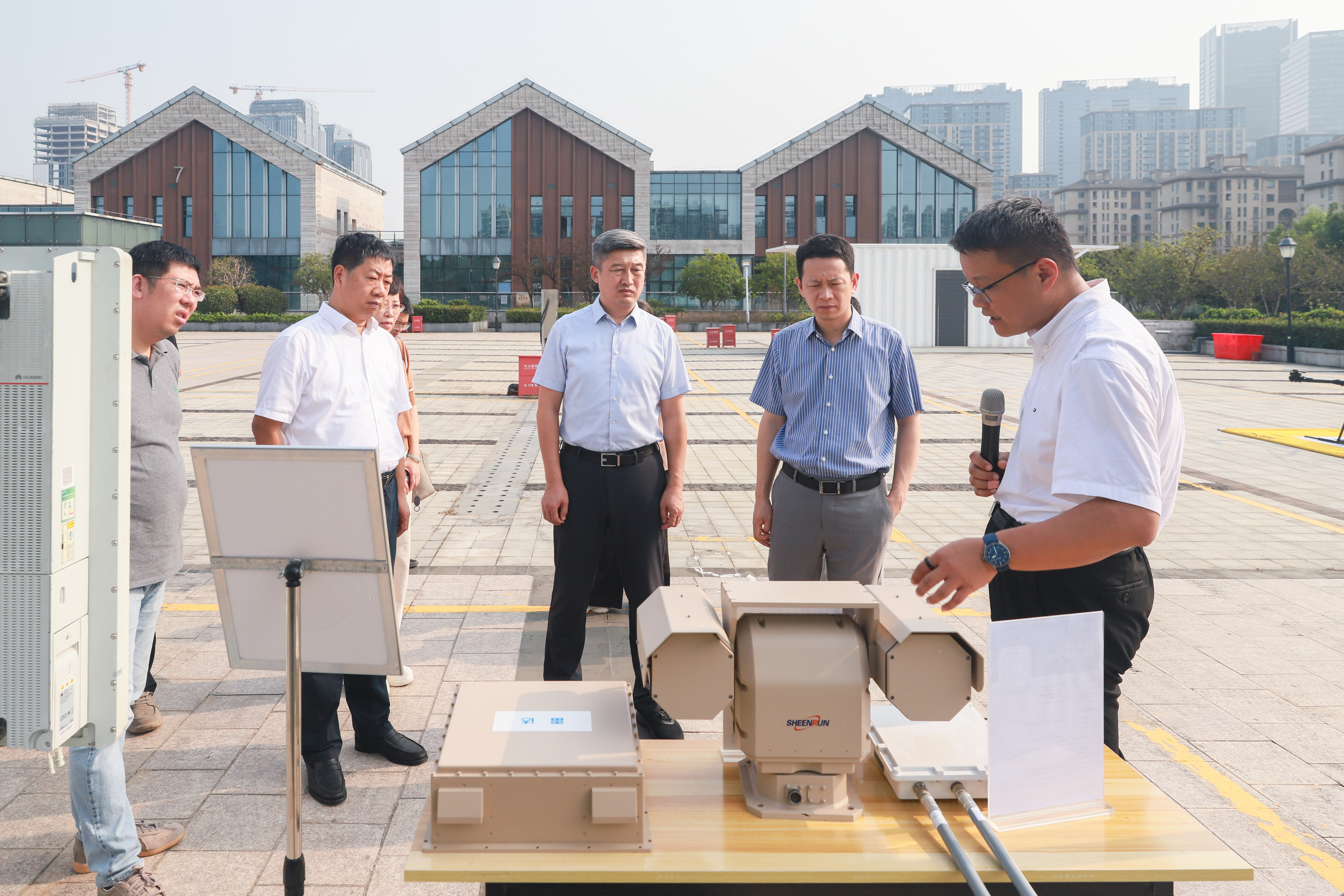杭州低空公司董事长、总经理刘晨作详细介绍:该起降场作为杭州首批2座枢纽型无人机公共垂直起降场之一,硬件配置完备,不仅设有12个标准化起降单元与1个应急降落单元,还配套建设运控中心、充换电及存储空间、消防系统等支撑设施,为低空作业提供全流程保障。在场景应用层面,刘晨表示,梦想小镇公共起降场已成功集聚迅蚁、丰翼、韵鸢等国内头部无人机物流企业,在 “低空+医疗”(血液与医疗物资运输)、“低空+物流”(同城快件即时配送)等领域形成规模化运营格局,成为低空场景落地的重要示范载体。此外,为进一步夯实安全飞行能力,在市低空专班统筹指导下,杭实集团已牵头围绕该起降场划设10平方公里测试区,针对 “通信、导航、监测、气象、安全反制” 等低空核心基础设施开展全方位测试。现场,刘晨还对测试设备的功能原理与应用效果进行了细致讲解,让调研组直观了解低空安全保障技术的实践进展。