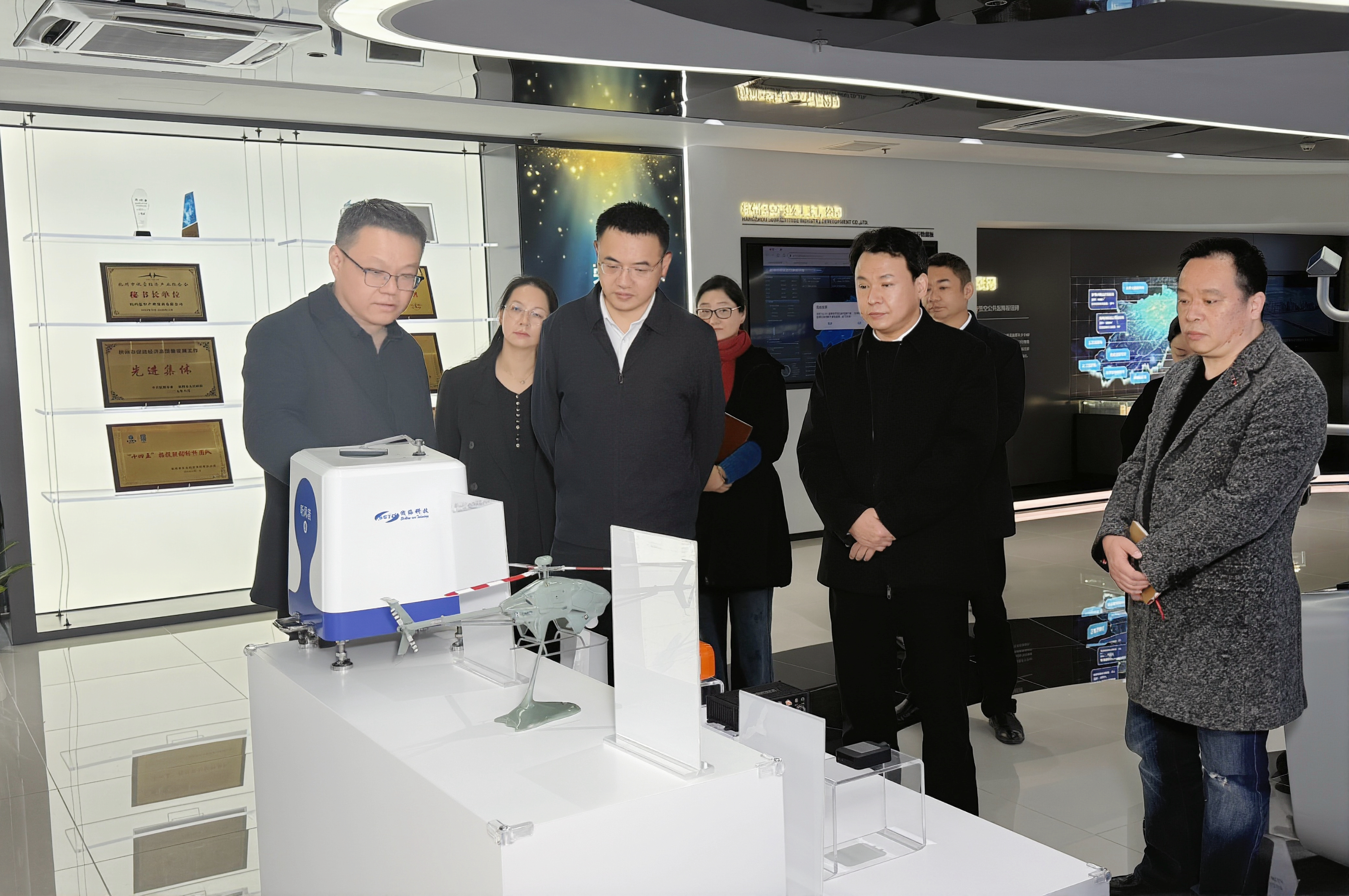 沈晓栋一行参观了公司展厅和7楼指挥大厅,观摩了杭州市低空综合管理服务平台的系统演示,系统了解了杭州低空公司在飞行服务保障、低空基础设施建设、产业生态构建等领域取得的阶段性成果,对公司在低空经济这一新兴行业中发挥的牵头与衔接作用给予高度肯定。