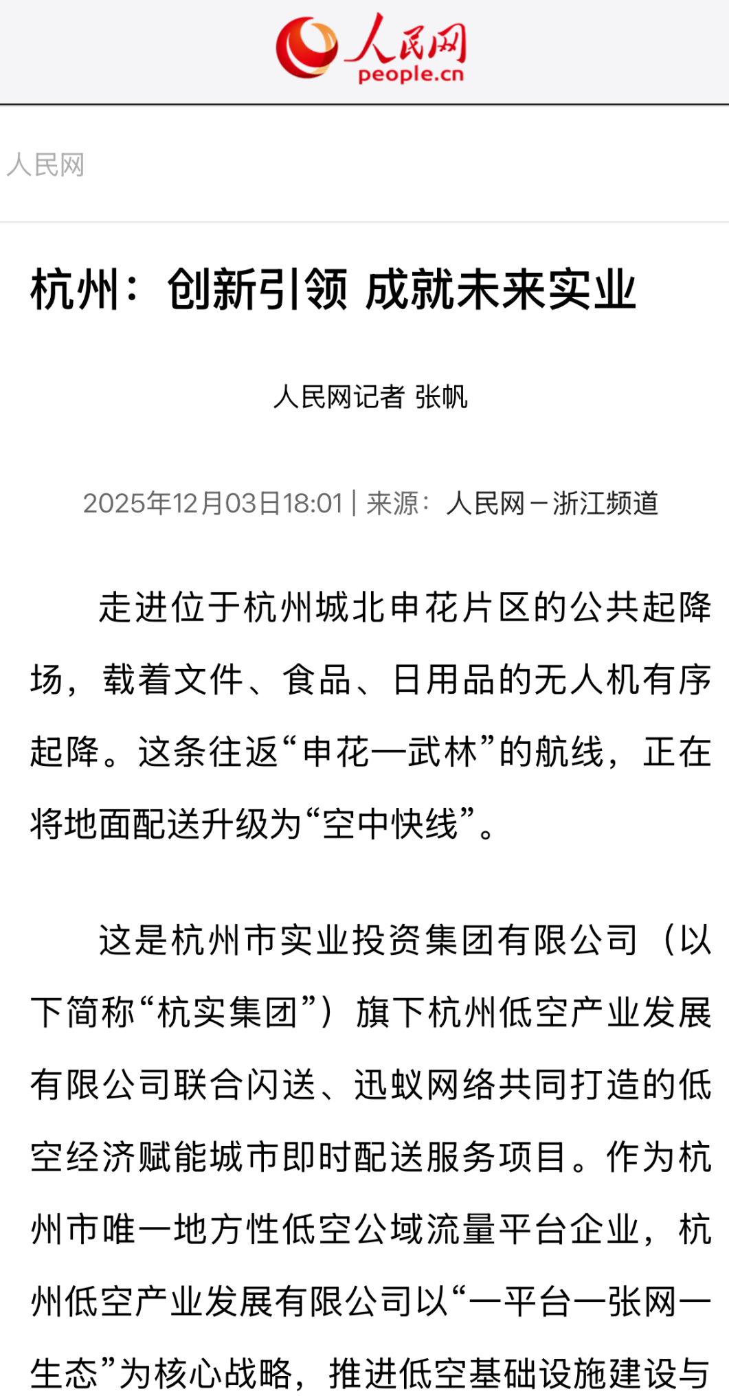 活动首站,媒体代表们走进了杭州低空公司建设的申花起降场,体验了无人机闪送场景的便利。钮健介绍了杭实集团的业务概况以及集团在推动科技创新和产业创新深度融合方面的做法,就媒体代表们关于如何打造“杭州样板”、杭实何以成就未来实业、杭实如何助力杭州城市跃升等问题详细解答。